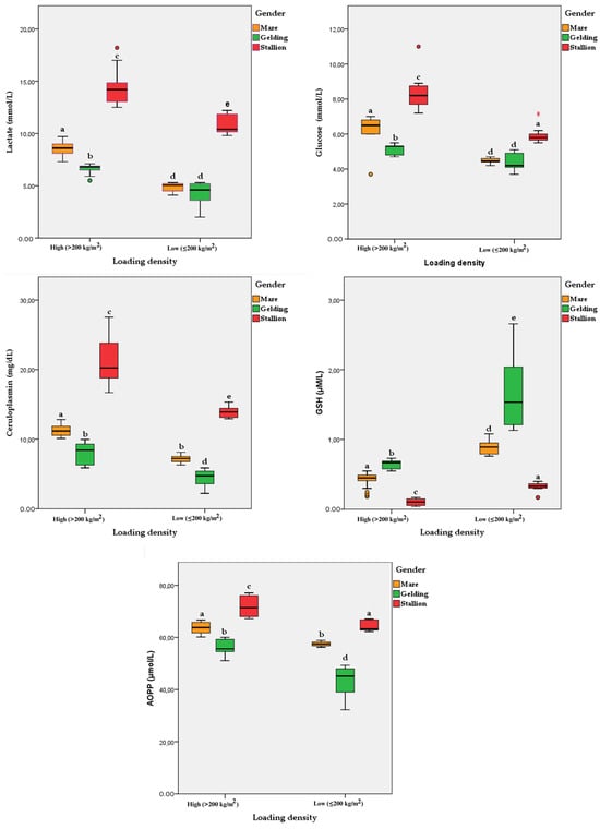 | Gender | Mares | Geldings | Stallions | Mares | Geldings | Stallions | Loading Density | Gender | Loading Density × Gender |