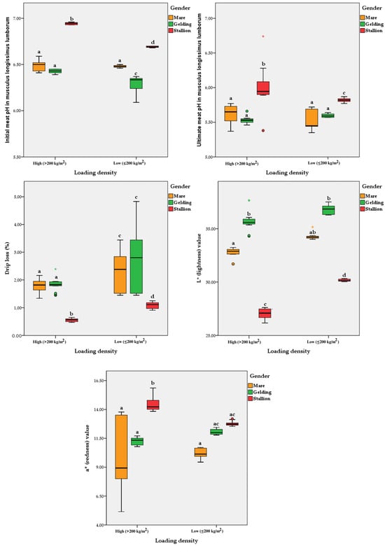 4.2. The Effects of Loading Density and Gender on the Horsemeat Quality Characteristics