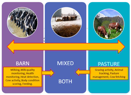 An important aspect to consider in automating the dairy cattle sector is the different rearing methods available: enclosed facilities, where cows are essentially kept in barns; grazing; and the mixed system, which is a combination of the aforementioned two. The utilisation of these technologies is more prevalent in closed farms, whereas their adoption in pasture systems is comparatively limited. An illustrative example of pervasive technology in grazing-based dairy farms includes heat detection sensors and chew sensors, which record mandibular activity, allowing the assessment of forage availability in the area where animals are kept [43]. Figure 3 summarises the main processes that can be automated and monitored using specific sensors.