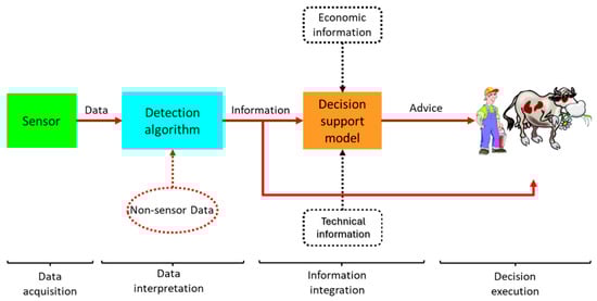 The application of automation fits with the trend of fewer but larger herds, narrower profit margins than in the past, and continuous improvement of technology already available that becomes less costly [40,41,42]. Automation allows collection of a large amount of data from the monitored animals and the surrounding environment. After an appropriate elaboration process, data provide helpful information for farmers to control and manage herds by allowing them to make the right decisions [25].