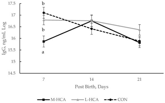 Immunoglobulin-G concentrations for piglets over a 21-day lactation period were born to maternally stressed sows, n = 36. Sow treatments were hydrocortisone acetate (HCA) capsules or placebo (CON) fed for 21 days during mid-gestation (M-HCA) or late gestation (L-HCA). Data are expressed as means ± the standard error of the mean. a,b Means with different superscripts differ at p-value < 0.05 between treatments within a day according to the Tukey–Kramer adjustment.