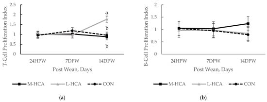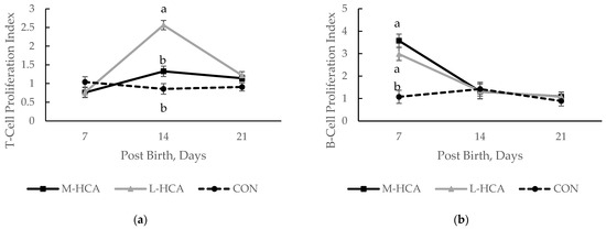 The mitogen-induced T-cell lymphocyte proliferation index was also affected across the 21-day lactation period, with those piglets born to L-HCA-treated sows having the highest index, while those piglets from CON sows had the lowest index at 14D post-birth (Figure 2a). The mitogen-induced B-cell lymphocyte proliferation index was highest in piglets from M-HCA-treated sows and lowest in those from CON ones at D7 post-birth (Figure 2b). Interestingly, these piglets had the highest B-cell proliferation and the lowest IgG concentrations, which is the opposite of what one would expect since B-cells are associated with humoral immunity.