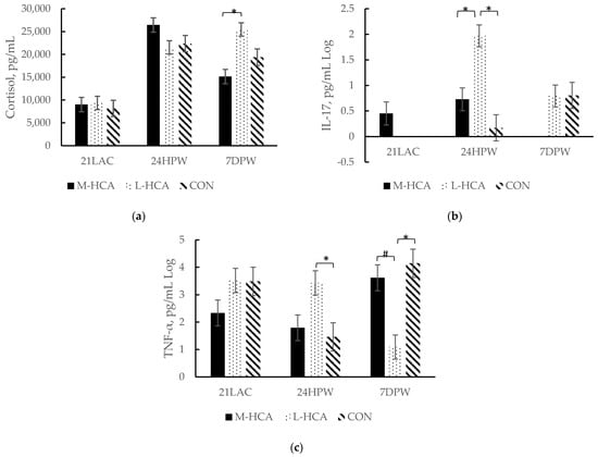Plasma cortisol (p-value = 0.09), IL-17 (p-value = 0.04), TNF-α (p-value = 0.02) and mitogen-induced T-cell lymphocyte proliferation indexes (p = 0.01) were affected by maternal treatment, with those from M-HCA-treated and CON sows having similar concentrations and those from L-HCA-treated ones differing in response to weaning. Specifically, cortisol concentrations peaked 24 h post-weaning among piglets from M-HCA-treated sows and CON ones (Figure 3). The cortisol response to weaning stress did not peak until 7 days post-weaning among those piglets from the L-HCA-treated sows. These piglets also had higher concentrations of pro-inflammatory cytokines, including IL-17 and TNF-α, at 24 h post-weaning than piglets from M-HCA or CON dams (Figure 3). Conversely, TNF-α concentrations peaked at 7D post-weaning among those piglets from the M-HCA-treated and CON sows. However, no effect on IL-17 was observed, but it should be noted that IL-17 may be involved in monocyte recruitment. Piglets from L-HCA-treated sows also had higher monocyte percentages in the post-wean phase (M-HCA = 7.07%, L-HCA = 8.10% and CON = 7.99%; p-value = 0.04). Moreover, anti-inflammatory IL-4 concentrations were lowest overall for piglets from M-HCA-treated sows in the post-wean phase than piglets from L-HCA or CON sows (p-value = 0.03).