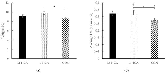 Effect of maternal treatment on body weight (a) and average daily gain (ADG) (b) in piglets overall for the post-wean phase, n = 36. Sow treatments were hydrocortisone acetate (HCA) capsules or placebo (CON) fed for 21 days during mid-gestation (M-HCA) or late gestation (L-HCA). Data are expressed as means ± standard error of the mean. Means with a * differ at p-value < 0.05, and means with a # between treatments differ at 0.05 < p-value < 0.10 according to the Tukey–Kramer adjustment. Treatment effect p-value = 0.04 for weight and p-value = 0.04 for ADG.