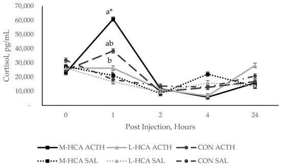 Pig plasma cortisol concentrations at various time points post-ACTH or saline injections at 21 days post-wean, n = 24. Injection type was adrenocorticotropic hormone (ACTH) or saline (SAL). Sow treatments were hydrocortisone acetate (HCA) capsules or placebo (CON) fed for 21 days during mid-gestation (M-HCA) or late gestation (L-HCA). Data are expressed as means ± standard error of the mean. Means denoted with a different alphabetical superscript differ at p < 0.05 across sow treatment but within injection type, means denoted with * differ at p-value < 0.05 within sow treatment but across injection type according to the Tukey–Kramer adjustment. Treatment × Injection Type × Hour p < 0.01.