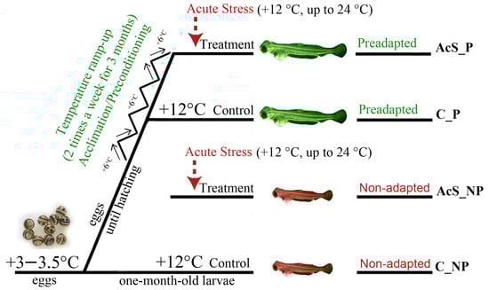 The temperature experiment on one-month-old Baikal whitefish larvae. The water temperature in the “acute stress for two hours” treatment aquariums was raised up to 24 °C (preadapted treatment (AcS_P) and non-adapted treatment (AcS_NP)), while the temperature in the “control” aquariums remained constant at 12 °C throughout the experiment (preadapted control (C_P) and non-adapted control (C_NP)).