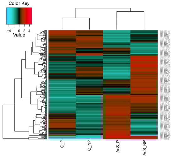 DEGs in Baikal whitefish after preadaptation and acute temperature rise. The heatmap shows the log fold change (logFC), p < 0.01. These are clustered according to similar expression patterns in the groups (Pearson correlation method). The complete counts can be found in the Supplementary Materials as S5 (logCPM) and S6 (logFC). Red indicates those genes with high expression levels, and green indicates those genes with low expression levels. C_NP—non-adapted control, C_P—preadapted control, AcS_NP—non-adapted treatment (acute stress), and AcS_P—preadapted treatment (acute stress).