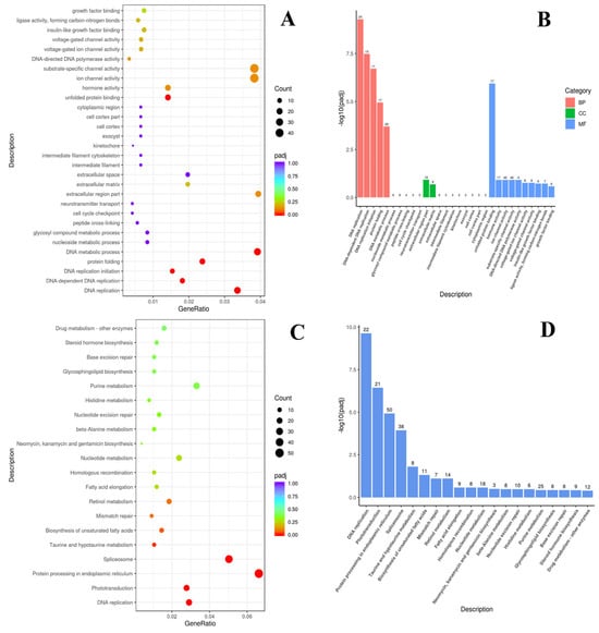 According to the KEGG analysis, the DEGs were enriched in pathways such as drug metabolism and other enzymes; steroid hormone biosynthesis; base excision repair; glycosphingolipid biosynthesis; purine and histidine metabolism; nucleotide excision repair; beta-alanine metabolism; neomycin; kanamycin and gentamicin biosynthesis; nucleotide metabolism; homologous recombination; fatty acid elongation; retinol metabolism; mismatch repair; biosynthesis of unsaturated fatty acids; taurine and hypotaurine metabolism; spliceosome; protein processing in the endoplasmic reticulum; phototransduction; and DNA replication. Among them, protein processing in the endoplasmic reticulum, spliceosome processes, DNA replication, mismatch repair, phototransduction, retinol metabolism, biosynthesis of unsaturated fatty acids, and taurine and hypotaurine metabolism were significantly enriched. The number of enrichments in protein processing in the endoplasmic reticulum and spliceosome processes pathways showed the highest values (Figure 3C,D).