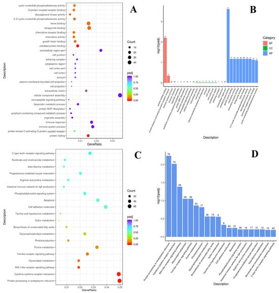 According to the KEGG analysis, the DEGs were enriched in pathways such as the C-type lectin receptor signaling pathway; nicotinate and nicotinamide metabolism; beta-alanine metabolism; progesterone-mediated oocyte maturation; arginine and proline metabolism; the intestinal immune network for IgA production; the phosphatidylinositol signaling system; apoptosis; cell adhesion molecules; taurine and hypotaurine metabolism; sulfur metabolism; the biosynthesis of unsaturated fatty acids; glycerophospholipid metabolism; phototransduction; purine metabolism; the toll-like receptor signaling pathway; glycerolipid metabolism; the RIG-l-like receptor signaling pathway; cytokine-cytokine receptor interaction; and protein processing in endoplasmic reticulum. It is notable that protein processing in the endoplasmic reticulum, cytokine–cytokine receptor interaction, RIG-l-like receptor signaling, the toll-like receptor signaling pathway, and glycerolipid metabolism pathways were significantly enriched, while the number of enrichments in protein processing in the endoplasmic reticulum and cytokine–cytokine receptor interaction pathways was the highest (Figure 4C,D).