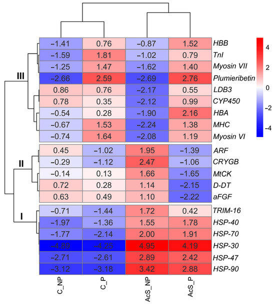 TnI and Plumieribetin showed similar expression patterns after preadaptation, as described above (C_P and AcS_P groups, Figure 5). TnI, the inhibitory subunit of the troponin complex in the sarcomeric thin filament of striated muscle, plays an essential role in the calcium regulation of contraction and relaxation [68]. TnI in skeletal muscle has been suggested to be a sensitive and rapid fiber-specific marker of alterations in skeletal muscle and may change to adapt to new environmental conditions [68]. In addition, the data demonstrate that TnI expression may change in the long term due to thermal preadaptation [68,69].