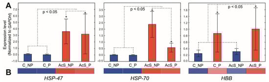 The following genes increased their expression after preadaptation, regardless of thermal stress (C_P and AcS_P groups, Figure 5): Hemoglobin subunit alpha (HBA), Hemoglobin subunit beta (HBB), Myosin VI, Myosin VII, Fast myosin heavy chain (MHC), Mannose-specific lectin (Plumieribetin), and Troponin-I fast skeletal muscle (TnI). According to their annotation, these genes belong to the group responsible for oxygen transport, growth factors, and the immune response, and appear to respond to thermal preadaptation (Table A4). Indeed, it has been previously reported [7,8,9] that fish exposed to a mild stressor, which could be considered as preadaptation, undergo an activation phase in which the innate immune response is enhanced (the hormesis effect).
