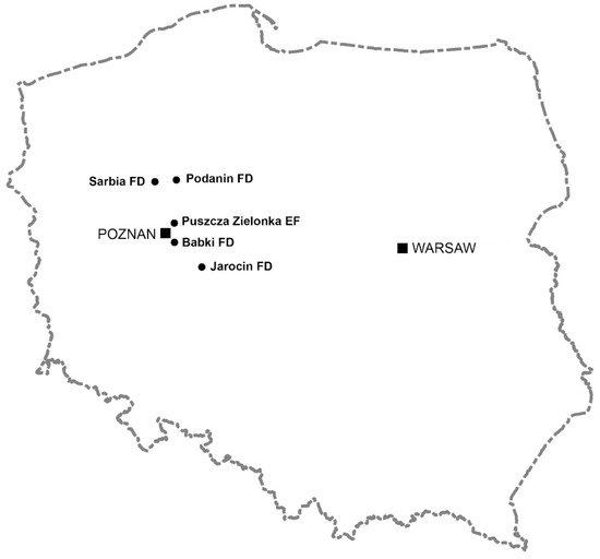 Location of areas in western Poland where the reproductive potential of roe deer was tested during the two following hunting years: 2015/2016 and 2016/2017 (Puszcza Zielonka experimental forest (EF), and Forest Districts (FDs) Babki, Jarocin, Podanin, and Sarbia).