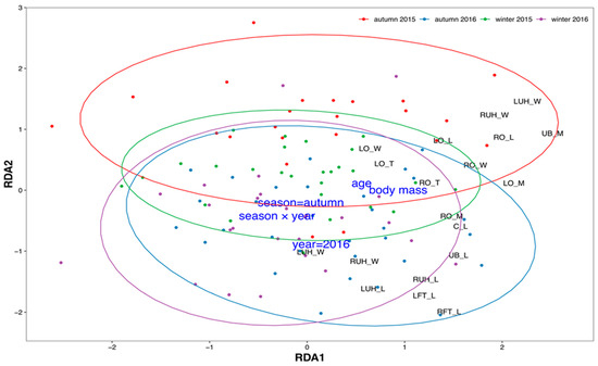 Multidimensional variability of morphometric characteristics depended on all hypothesized factors: body mass, age, season, year, and season × year interaction (Figure 4).