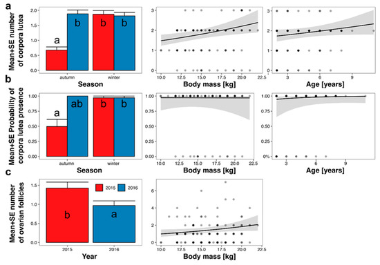 Marginal responses of the number of corpora lutea CL (a), probability of CL presence (b), and number of follicles (c) to predictors from final models (Table 3), calculated from GLMMs. Lines indicate marginal response (i.e., prediction without random effects and assuming all other predictors at a constant level); grey area—range of standard error; and points—observed values. Letters on bars indicate the results of Tukey’s posteriori test: groups denoted by the same letter did not differ at p = 0.05.