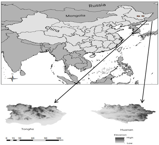 This study was conducted in the Huanan and Tonghe Counties in Heilongjiang Province, China. Huanan County (129°54′55′~131°16′2′ E, 46°22′23′~46°20′15′ N) is located in the eastern part of Heilongjiang Province, with a total area of 4417.9 km