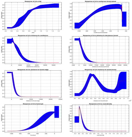 The MaxEnt Model was repeated for 10 runs, and the average AUC was 0.973. Among all environmental factors, the distance from the coniferous and broad-leaved mixed forest contributed the highest, reaching 14.2%, followed by patch density (13.0%), forest density (11.2%), distance from coniferous forest (11.1%), distance from the forest margin (9.0%), road density (8.3%), the Shannon diversity index (6.7%), and distance from broad-leaved forest (5.9%). The contribution rates of the other environmental factors were less than 5%. The sensitivity analysis of the effects of various environmental variables on the distribution of wild boar hazards revealed that wild boar hazards occurred between 200 and 300 m from the including altitude, and the risk index was maximized when the slope was within 0–10° or 50–150°. Regarding the distance from the forest margin, the distance from the coniferous forest, and the distance from the broad-leaved forest, the risk index decreased significantly as the values of these environmental factors increased. Furthermore, the risk index decreased as road density and river density increased. With a decrease in the coniferous forest proportion, the proportion of broad-leaved forest, and mixed forest proportion, the risk index also decreased. With an increasing patch density, fragmentation, and diversity index, the risk index increased. At about 5000 m away from settlements, the risk index reached a maximum. Meanwhile, the risk was nearly 0 at 5000 m from the forest margin (