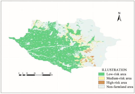 2, respectively. The high-risk areas were mainly focused at the junction of forest and farmland in the eastern and southern parts of the study area (
