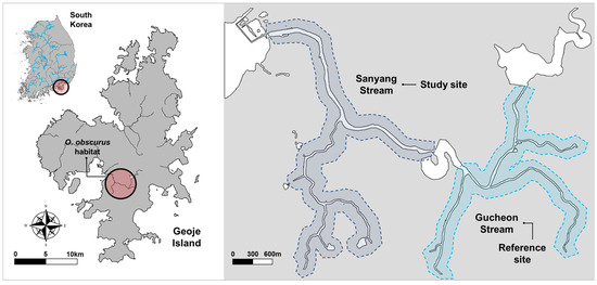 - Park, S.-H.; Kim, J.-H.; Baek, S.-H.; Jo, H. Distribution and Habitat Characteristics of Odontobutis obscura, Endangered Species. Korean J. Ecol. Environ. 2021, 54, 79–86. [Google Scholar] [CrossRef]