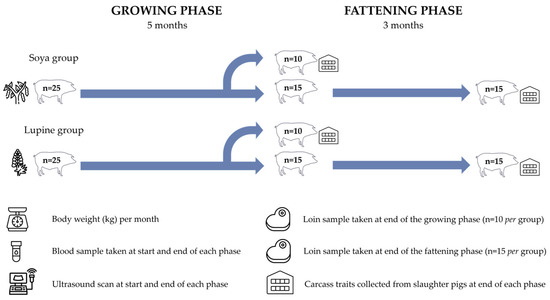 The general aim of this work was to evaluate the use of lupine as an alternative protein source in the production of high-quality Iberian pig products, with a focus on improving sustainability. The specific objectives were: (a) to evaluate growth and metabolic parameters during the pre-finishing and fattening phases in Iberian pigs under a concentrate diet based on soy or in lupine, and (b) to evaluate the carcass yield and the quality of the meat obtained during these different stages of production.