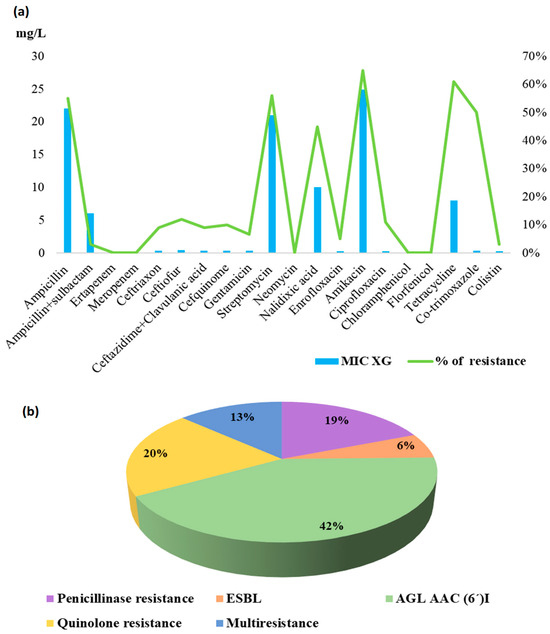 Percentage of resistance and MIC xG values (a); mechanism of resistance (b) in E. coli isolates from cattle feces.