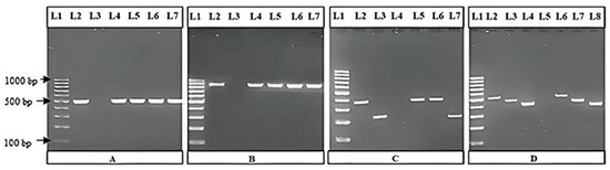 - L1—standard GeneRuler 100 bp DNA ladder, L2—positive control, L3—negative control, L4—L7 isolates positive for blaTEM gene (858 bp);