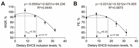 The relationship between dietary inclusion EHCS levels and the WGR (A) and FE (B) of juvenile American eels. Values are shown as mean ± S.D. (n = 4).