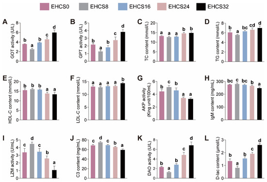 Effects of dietary EHCS inclusion on the serum biochemical parameters of juvenile American eels. (A) GOT activity. (B) GPT activity. (C) TC content. (D) TG content. (E) HDL-C content. (F) LDL-C content. (G) AKP activity. (H) lgM content. (I) LZM activity. (J) C3 content. (K) DAO activity. (L) D-lac content. Values are shown as mean ± S.D. (n = 4). Letters (a–d) denote significance at p < 0.05. AKP, acid phosphatase; C3, complement 3; D-lac, D-lactate; DAO, diamine oxide; GOT, glutamic-oxalacetic transaminase; GPT, glutamic-pyruvic transaminase; HDL-C, high-density lipoprotein cholesterol; IgM, immunoglobulin M; LDL-C, low-density lipoprotein cholesterol; LZM, lysozyme; TC, total cholesterol; TG, triglyceride.