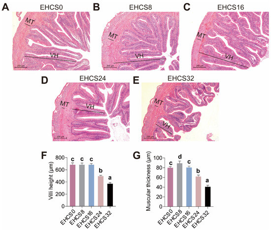 The effects of dietary EHCS inclusion on the intestinal histology are illustrated in Figure 3. American eels fed the EHCS8 diet exhibited increased muscular thickness (MT), whereas those fed the EHCS24 and EHCS32 diets exhibited decreased MT and villus height (VH) compared to those fed the EHCS0 diet (Figure 3). There was no significant difference in MT and VH between American eels fed the EHCS0 and EHCS16 diets (Figure 3).