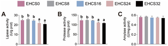 The effects of dietary EHCS inclusion on the intestinal digestive enzyme activities are illustrated in Figure 4. American eels fed the EHCS8 and EHCS16 diets showed no significant differences in lipase and protease activities, whereas those fed the EHCS24 and EHCS32 diets exhibited lower lipase and protease activities compared to those fed the EHCS0 diet (Figure 4A,B). Different dietary inclusion levels of EHCS had no effects on amylase activity (Figure 4C).
