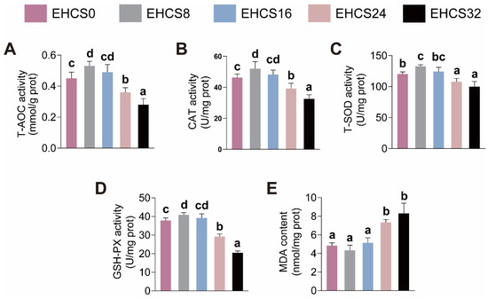 Effects of dietary EHCS inclusion on the intestinal antioxidant capacity of the juvenile American eels. (A) Total antioxidant capacity (T-AOC); (B) catalase (CAT) activity; (C) total superoxide dismutase (SOD) activity; (D) glutathione peroxidase (GSH-Px) activity; (E) malondialdehyde (MDA) level. Values are shown as mean ± S.D. (n = 4). Letters (a–d) denote significance at p < 0.05.
