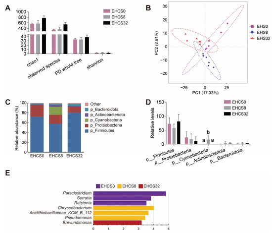 Effects of dietary EHCS inclusion on the intestinal microbiota. (A) Alpha diversity of the intestinal flora. Values are shown as mean ± S.D. (B) Beta diversity of the intestinal flora. (C,D) The relative abundance of the intestinal bacterial phyla. Letters (a,b) denote significance at p < 0.05. (E) The Lefse analysis of the intestinal bacterial genus.