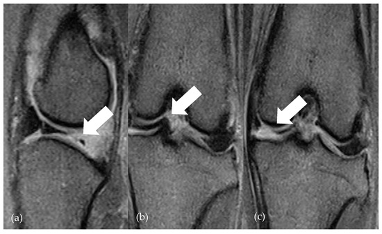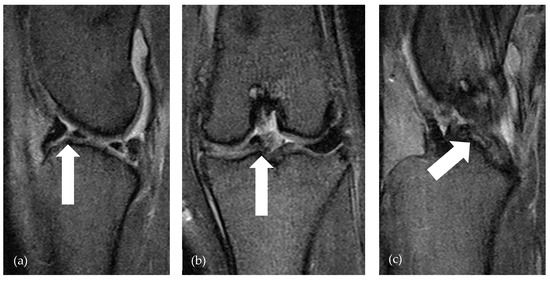 lfMRI of a folded fragment (arrows) of medial meniscus in GE T2 sag (a) and GE T2 dor (b,c). The arrow in (a) points to the missed meniscal tissue, the arrow in (b) points to the axial displaced fragment, and the arrow in (c) shows the reproducible increase in signal in the dorsal view.