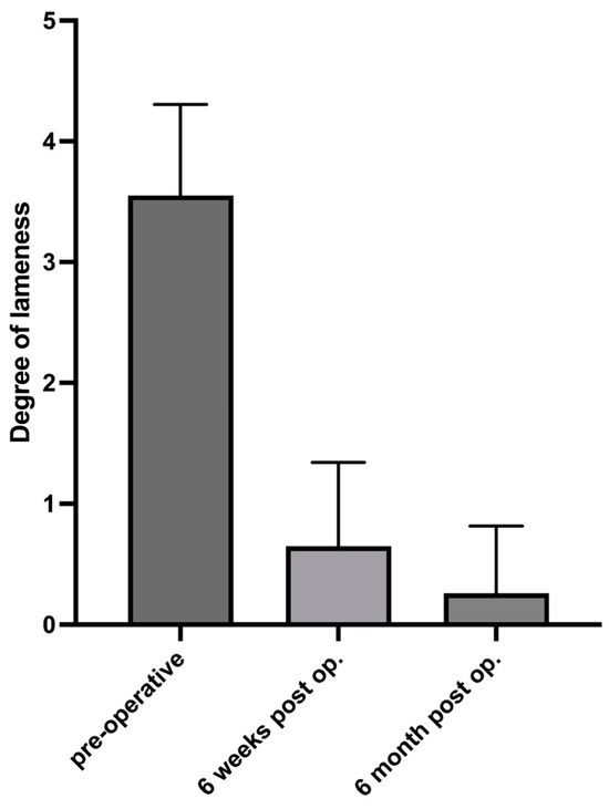 Lameness evaluation preoperatively and at 6 weeks and 6 months postoperatively.