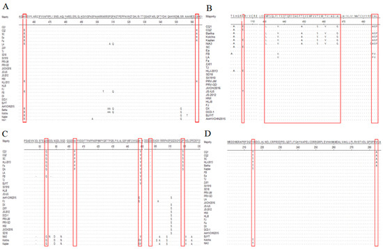 Amino acid sequence alignments of PRV gB (A), gC (B), gE (C), and TK (D). The alignment sequence is from Table 2, and the red box indicates the mutation base.