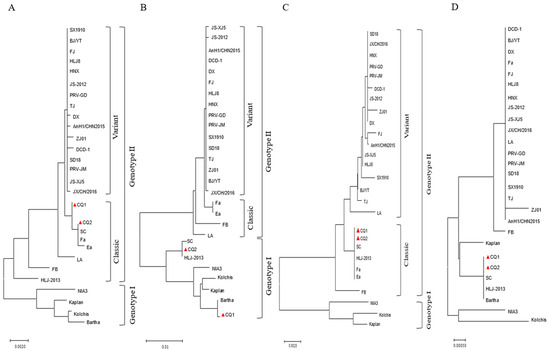 The phylogenetic tree analysis based on the gC gene categorized the PRV strains into two genotypes: genotype I and genotype II. The Chinese strains of PRV were grouped into genotype II, whereas genotype I was primarily composed of international strains (Figure 3B). Interestingly, within genotype I, the CQ1 and CQ2 strains were situated on separate sub-branches. The CQ1 strain was closely related to the Bartha strain on the same sub-branch. In contrast, the CQ2 strain was part of a sub-branch that also included the SC strain and HLJ-2013 strain, which has been circulating since 2013 [36].