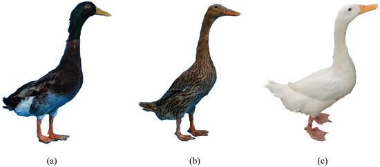 External characteristics of Matahu ducks: (a) male ducks of the original group; (b) female ducks of the original group; (c) white-feathered individuals (no distinction between males and females).