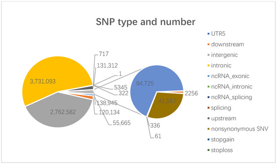 The filtered clean data were aligned to the reference genome, yielding an average alignment rate of 99.68% per sample and an average sequencing depth of 36.98. On average, 7,103,821 variant sites were identified per individual (Table S1), and the distribution and number of variant loci were summarized (Figure 2).