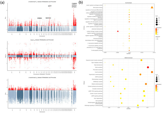 FST is a powerful tool for detecting regions under selective sweeps, particularly when analyzing functional regions closely associated with environmental adaptation, which often exhibit strong selection signals. The π ratio is calculated based on the ratio of paired intervals of population chromosomes, representing the differences in polymorphism levels between two populations. This measure reflects the extent of differential selection pressure across genomic intervals in distinct populations. DXY is a similar metric to the π ratio but focuses exclusively on inter-population comparisons, highlighting the differences in polymorphisms and indicating whether populations are subject to divergent selection pressures within the same genomic regions. To minimize the risk of false positives, we employed FST, π ratio, and DXY to analyze selection signals between the ancestral population of Lake Matahu ducks and a recently emerged white-feathered population. These analyses were conducted using the PIXY software (v1.2.7.beta1) [16], focusing on the top 5% of the genome exhibiting high differentiation under strong selective pressure. The window size for all selective sweep analyses was uniformly set to 10 kb. Genes within the regions under selection were identified for further investigation.