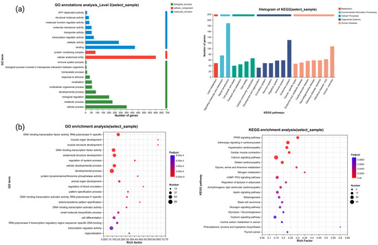 Functional enrichment of differentially expressed genes from transcriptome data: (a) gene annotation analysis; (b) gene function enrichment analysis.