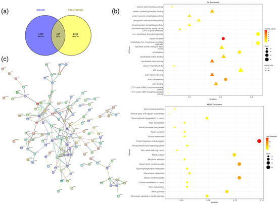 Analysis of the portion of the genome subject to selection of regions overlapping with the differentially expressed genes of the transcriptome: (a) Wehn diagram statistics for overlapping genes; (b) functional enrichment analysis of genes in overlapping sections; (c) analysis of protein interactions of genes and overlapping partial gene proteins involved in candidate pathways associated with plumage color traits.