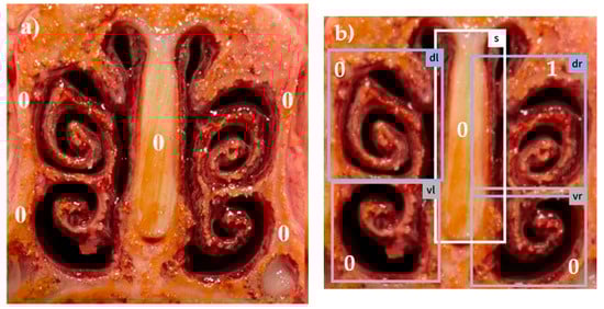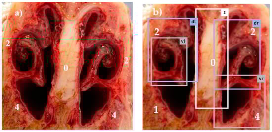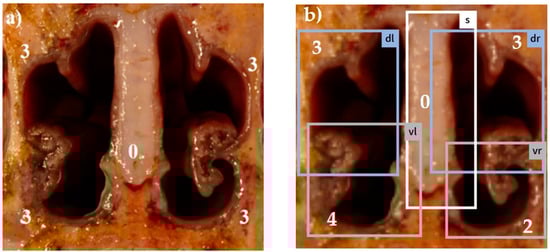 Figure 1, Figure 2, Figure 3, Figure 4 and Figure 5: Photos of the nasal cross sections from five of the 121 examined pigs; (a) visual scoring (b) automated scoring; boxes in (b) = regions of interest created by the app for scoring; vl = ventral left; dl = dorsal left; vr = ventral right; dr = dorsal right; S = nasal septum. The numbers next to the evaluated anatomical parts represent the respective scores for this part. The total nasal lesion score (NLS) defined either visually (a) or automatically by the app (b) is depicted beyond the respective photo.
