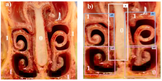 The first line of defense against airborne pathogens, particles, and gases causing respiratory disease is the nose with the function of air warming, filtering, and mucosal immune response [11]. In case of nasal conchae atrophy the filtering function is disturbed. The detection of nasal conchae atrophy and subsequent examination for toxigenic P. multocida expressing the P. multocida toxin (PMT) for exclusion of progressive atrophic rhinitis (PAR) is an important diagnostic step. Examination for B. bronchiseptica as a cause for non progressive atrophic rhinitis (NPAR) is also of high importance. The nasal turbinate deformations in NPAR are reversible and milder in contrast to those in PAR [12]. For assessment of nasal conchae atrophy in pigs in nasal cross sections a standardized scoring scheme exists [13,14], which was a good starting point for development of an automatic assessment tool using artificial intelligence (AI). The assessment of organ alterations with the help of AI in healthcare is still in its early stages also in human medicine. In so called supervised learning algorithms deep learning models are trained on vast datasets of medical images, which are annotated by medical experts to indicate the presence and severity of specific organ changes [15]. By training the deep neuronal network with these annotated images, the AI models can learn to identify patterns and features associated with different conditions. When presented with a new image, a successfully trained network can then provide a probability or classification of the organ’s health status. The acquisition of well-annotated datasets is the most challenging part of training AI models. The selection of divers and broad data for training is crucial to avoid overfitting of the AI models and help them to generalize well on other datasets or populations [16].