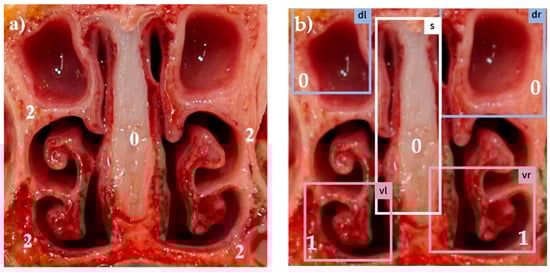 The nasal cross section was cleaned by flushing with tap water, and photographed with a single lens reflex camera (DMC-FZ1000, Panasonic Holdings Corporation, Kadoma, Japan). Afterwards, the nasal cross section was scored visually following a standardized scoring scheme by the same experienced observer [13,14]. Automated scoring based on the photos of the nasal cross sections was performed retrospectively using the AI DIAGNOS app (version 3.3.0).