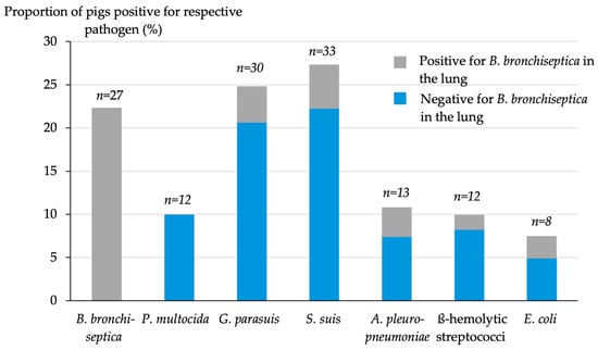 Prevalences of different pathogens in the lower respiratory tract (n = 121); numbers above the bars represent the number of pigs positive for the respective pathogen. The shaded grey parts of the bars depict the proportion of pigs simultaneously positive for B. bronchiseptica in the lung.