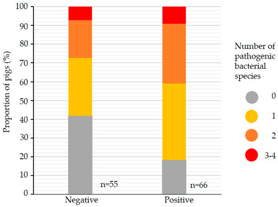 Number of pathogenic bacterial species in the lower respiratory tract in pigs positive and negative for B. bronchiseptica in the nose by PCR (n = 121).