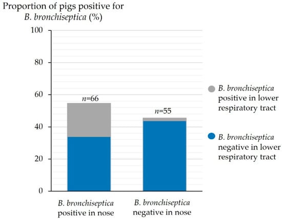 Detection of B. bronchiseptica in the nose and the lower respiratory tract (n = 121).