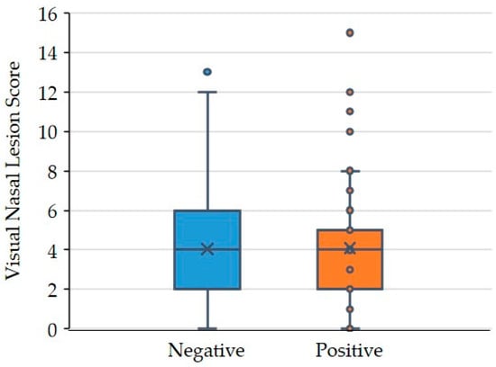 Association between B. bronchiseptica and severity of nasal turbinate lesions (n = 121); blue (negative for B. bronchiseptica in nose) and orange boxes (positive for B. bronchiseptica in nose) represent the interquartile data of the nasal lesion score (50% between 25% and 75% quartiles). The lines inside the boxes indicate the median. The upper and lower fences are defined as first and third quartile (represented by the lower/upper edge of the box) with minus/plus 1.5 times the interquartile range (IQR) indicating outliers (dots outside the boxes).