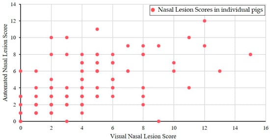 Correlation between visual and automated nasal lesion scores (n = 121).