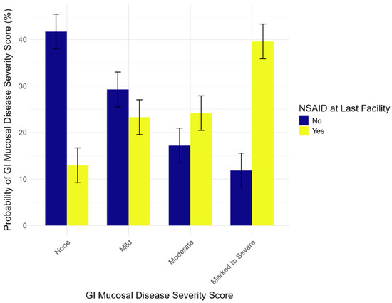 We also report that, while housed at their final facilities for an average of 7 years before death, wolves that received at least one NSAID prescription were significantly more likely to exhibit more severe GI disease (Estimate = 1.8, Std. Error = 0.77, p = 0.02). For example, wolves administered one or more NSAIDs in this time frame were 27.78% more likely to present a marked to severe GI diagnosis compared to wolves who did not receive the treatment (Figure 2).