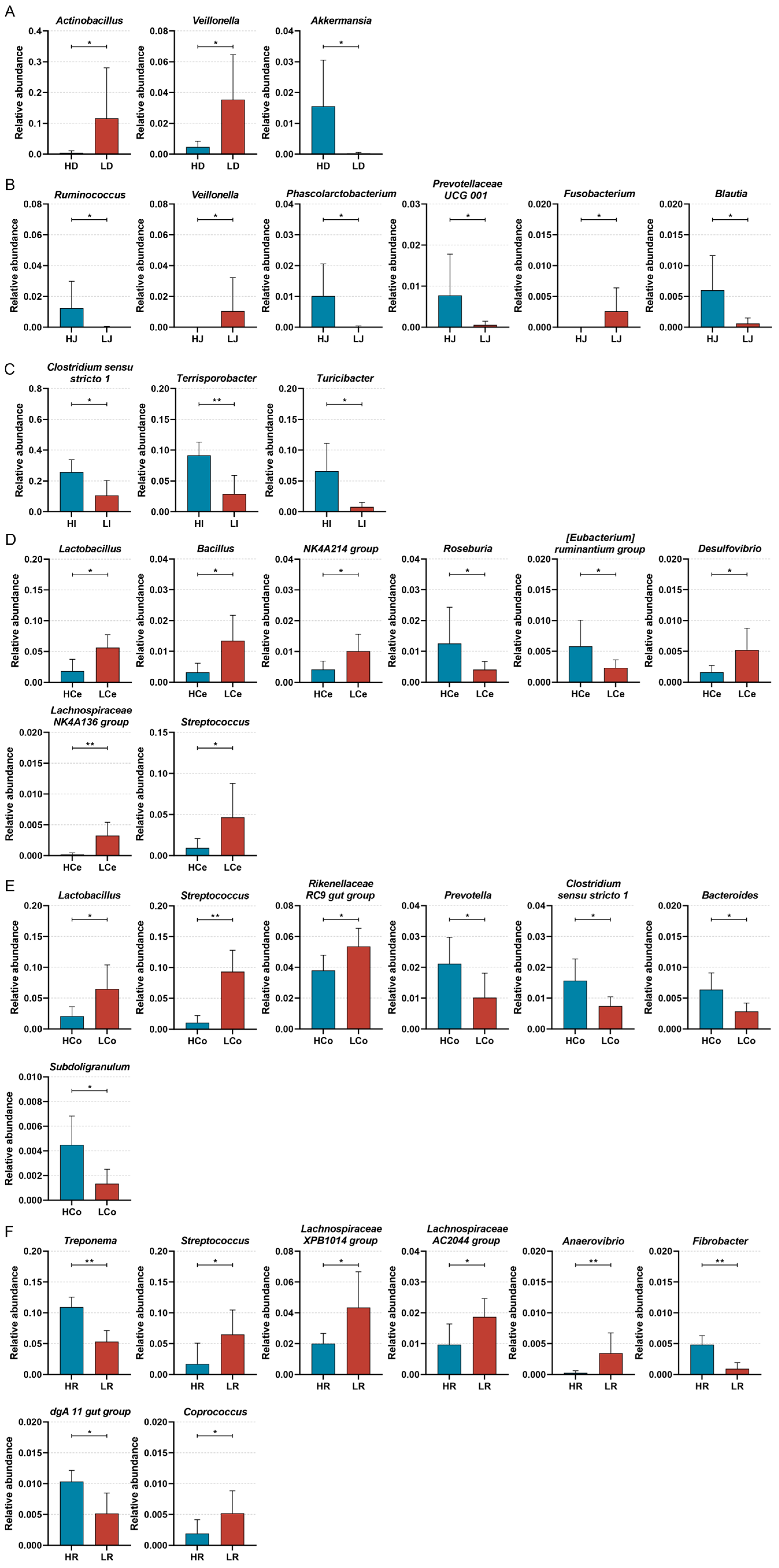 | Caecum | Bacillus | −0.778 ** | Rectum | Anaerovibrio | −0.608 * |